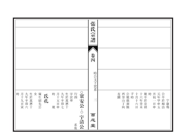 张氏宗谱 卷四 時公支下世系 時 月十九日寅 九年辛卯六 生於萬厯十 女 廩生紹先公 氏孔 時 月十五日申 九年辛卯七 生於萬厯十 字世華 行四 寰安公 有圖 西癸山丁向 公妣俱葬縣 子時 十月十六日 十六年癸未 妣卒於崇禎 時 月初一日申 元年甲申五 公卒於順治 三 宇 康 妣 殤 百忍堂 宇清公 系後