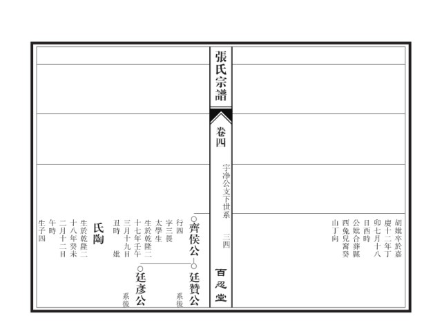 张氏宗谱 卷四 宇净公支下世系 生子四 午時 二月十二日 十八年癸未 生於乾隆二 氏陶 丑時 三月十九日 十七年壬午 生於乾隆二 太學生 字三畏 行四 齊侯公 山丁向 西兔兒窩癸 公妣合葬縣 日酉時 卯七月十八 慶十二年丁 胡妣卒於嘉 三四 妣 百忍堂 廷彥公 廷贊公 系後 系後