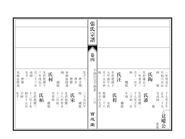 生子一 子時 四月十五日 十二年丁亥 生於乾隆三 氏柏 日寅時 十二月初一 十八年癸未 生於乾隆二 氏宋 時 二十九日午 年辛巳九月 乾隆二十六 氏程 午時 二月初一日 十七年壬午 生於乾隆二 氏潘 日戌時 正月二十九 十七年壬午