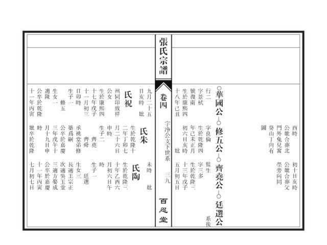 十一年丙寅 公卒於乾隆 適陳 生女一 生子一 日卯時 十一月初三 十七年戊子 生於康熙四 公女 州同印致祥 氏祝 日亥時 九月二十五 十八年己丑 生於康熙四 號復南 字景栻 行二 華國公