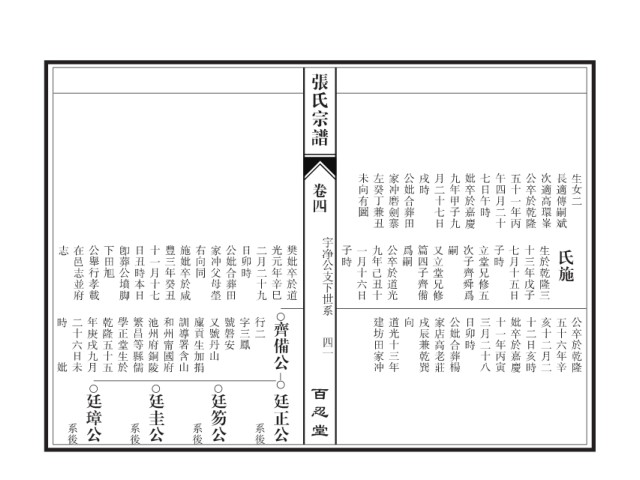 志 在邑志並府 公舉行孝載 下田 卽葬公墳脚 日丑時本日 十一月十七 豐三年癸丑 施妣卒於咸 右向同 家冲父母塋 公妣合葬田 日卯時 二月二十九 光元年辛巳 樊妣卒於道 子時 一月十六日 九年己丑十 公卒於道光 爲嗣 篇四子齊備 又立堂兄修 嗣 次子齊舜爲 立堂兄修五 子時 七月十五日 十三年戊子 生於乾隆三 氏施
