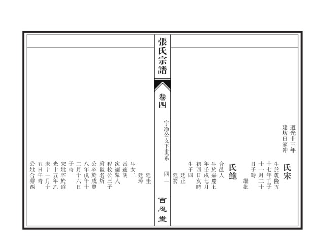 张氏宗谱 卷四 宇净公支下世系 建坊田家冲 道光十三年 公妣合葬西 五日午時 未十一月十 光十五年乙 宋妣卒於道 子時 二月十六日 八年戊午十 公卒於咸豐 附監名炘 程枚公三子 次適舉人 長適胡 生女二 生子四 初四日亥時 年壬戌七月 生於嘉慶七 合邑人 氏鮑 日子時 十一月二十 十七年壬子 生於乾隆五 氏宋 廷笏 廷正 廷璋 四二 廷圭 繼妣 百忍堂