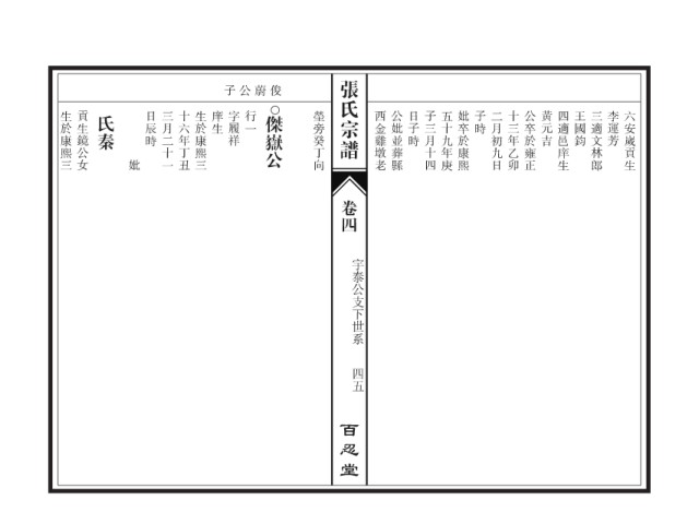 张氏宗谱 子公蔚俊 生於康熙三 貢生鏡公女 氏秦 日辰時 三月二十一 十六年丁丑 生於康熙三 庠生 字履祥 行一 傑嶽公 塋旁癸丁向 西金雞墩老 公妣並葬縣 日子時 子三月十四 五十九年庚 妣卒於康熙 子時 二月初九日 十三年乙卯 公卒於雍正 黃元吉 四適邑庠生 王國鈞 三適文林郎 李運芳 六安嵗貢生 妣 卷四 宇泰公支下世系 四五 百忍堂
