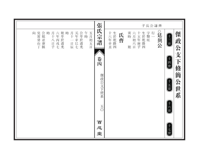 张氏宗谱 子長公謙齊 向 兒窩癸山丁 公妣並葬縣 時 月十八日子 六年丙戌七 妣卒於道光 時 月十一日辰 元年辛巳七 公卒於道光 午時 五月初五日 十六年辛丑 生於乾隆四 氏曹 寅時 六月初六日 十五年庚子 生於乾隆四 字翳旺 行一 廷興公 傑政公支下修簡公世系 十三世 妣 卷四 十四世 傑政公支下世系 十五世 十六世 五〇 百忍堂 十七世