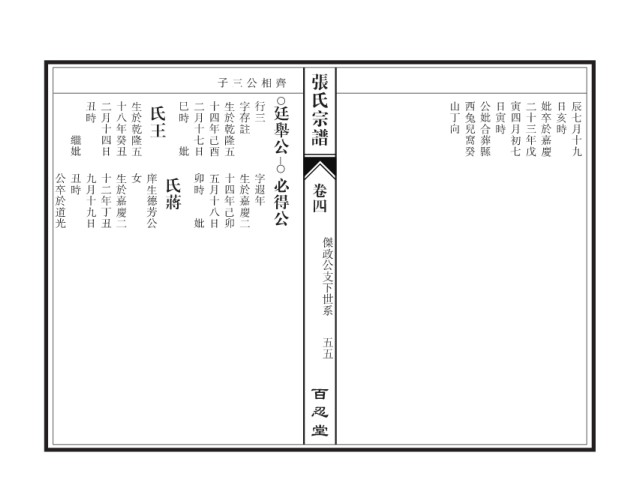 张氏宗谱 子三公相齊 丑時 二月十四日 十八年癸丑 生於乾隆五 氏王 巳時 二月十七日 十四年己酉 生於乾隆五 字存註 行三 廷舉公 山丁向 西兔兒窩癸 公妣合葬縣 日寅時 寅四月初七 二十三年戊 妣卒於嘉慶 日亥時 辰七月十九 繼妣 妣 公卒於道光 丑時 九月十九日 十二年丁丑 生於嘉慶二 女 庠生德芳公 氏蔣 卯時 五月十八日 十四年己卯 生於嘉慶二 字遐年 必得公 卷四 妣 傑政公支下世系 五五 百忍堂