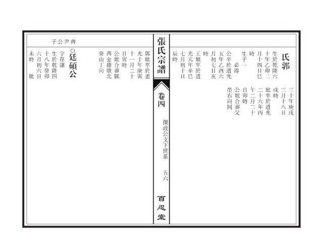 张氏宗谱 子公尹齊 未時 六月初六日 十八年癸卯 生於乾隆四 字存讓 廷碩公 癸山丁向 西金雞墩北 公妣合葬縣 日寅時 十一月二十 光十年庚寅 郭妣卒於道 辰時 七月初十日 光元年辛巳 王妣卒於道 時 月初七日亥 五年乙酉六 公卒於道光 生子一 時 月十四日巳 十年乙卯二 生於乾隆六 氏郭 必得 妣 塋右向同 公妣合葬父 日卯時 午二月二十 二十六年丙 妣卒於道光 戌時 三月十八日 三十年庚戌 卷四 傑政公支下世系 五六 百忍堂