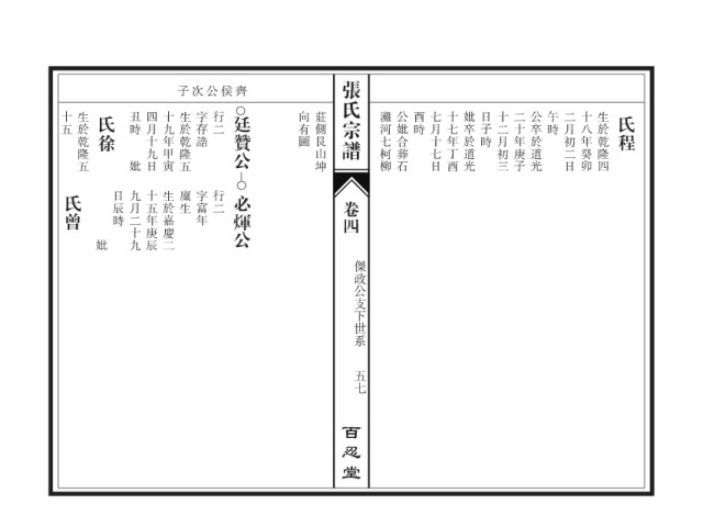 张氏宗谱 子 次 公 侯 齊 十五 生於乾隆五 氏徐 丑時 四月十九日 十九年甲寅 生於乾隆五 字存誥 行二 廷贊公 向有圖 莊側艮山坤 灘河七柯柳 公妣合葬石 酉時 七月十七日 十七年丁酉 妣卒於道光 日子時 十二月初三 二十年庚子 公卒於道光 午時 二月初二日 十八年癸卯 生於乾隆四 氏程 妣 氏曾 日辰時 九月二十九 十五年庚辰 生於嘉慶二 廩生 字富年 行二 必煇公 卷四 妣 傑政公支下世系 五七 百忍堂