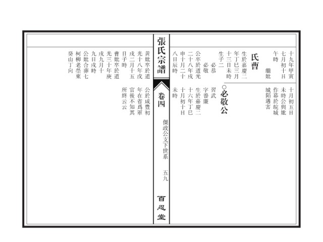 张氏宗谱 癸山丁向 柯柳老塋東 公妣合葬七 九日戌時 戌九月十 光三十年庚 曹妣卒於道 日子時 戌二月十五 光十八年戊 黃妣卒於道 八日辰時 申十月二十 二十八年戌 公卒於道光 生子二 十三日未時 年丁巳三月 生於嘉慶二 氏曹 午時 七月初十日 十九年甲寅 必敬 必恭 繼妣 所終云云 官後不知其 年在省爲軍 公於咸豐初 未時 十月初十日 十六年丁巳 生於嘉慶二 字養廉 習武 必敬公 城 作幕於皖城 未時公與妣 十月初五日 卷四 遇害 傑政公支下世系 五九 百忍堂