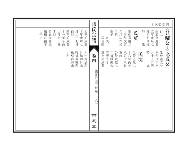 丁向 兔兒窩癸山 時當葬縣西 月初四日未 六年丙辰四 妣卒於咸豐 卒葬失考 年被賊擄去 公於咸豐七 亥時 八月十八日 十六年丙午 生於道光二 氏沈 時 月十五日寅 八年戊申八 生於道光廿 必成公