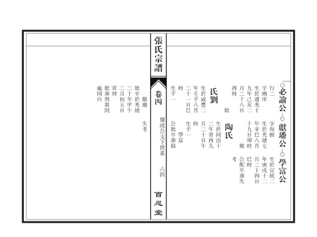 张氏宗谱 處同向 妣葬與翁同 寅時 二月初五日 二十年甲午 妣卒於光緒 生子一 時 二十一日巳 年壬子八月 生於咸豐二 氏劉 酉時 月二十八日 九年己亥二 生於道光十 字鴻庠 行二 必諭公 卷四 獻璠 妣 傑政公支下世系 失考 公妣卒葬俱 生子一 時 月二十日午 二年癸酉九 生於同治十 陶氏 十九日卯時 年辛巳八月 生於光緒七 字海樹 獻璠公 學富 妣 考 公配卒葬失 巳時 月二十四日 年庚戌十二 生於宣統二 學富公 六四 百忍堂