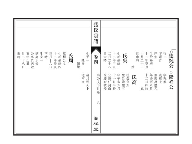 张氏宗谱 亥時 月二十八日 五年乙丑三 公卒於天啟 適高步云 生女一 酉時 三月十六日 十二年癸亥 生於嘉靖四 維楨公女 氏周 生子一 日未時 二月二十八 十二年甲寅 生於嘉靖三 氏吳 日申時 十月二十一 十二年癸丑 生於嘉靖三 庠生 字選青 行二 德純公 卷四 隆祥 繼妣 妣 宅河南 嵗月經久卜 時公支下世系 懷慶府教授 公厯任河南 十一日午時 年辛未六月 生於隆慶五 桂馨公女 氏高 十二日卯時 年癸酉八月 生於萬厯元 嵗進士 字兆熊 隆祥公 妣 八 百忍堂