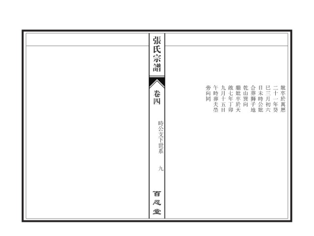 张氏宗谱 旁向同 午時葬夫塋 九月十五日 啟七年丁卯 繼妣卒於天 乾山巽向 合葬獅子地 日未時公妣 巳三月初六 二十一年癸 妣卒於萬厯 卷四 時公支下世系 九 百忍堂